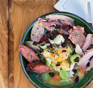 Tilsæt grønsagerne i suppen sammen med medisterpølse og krydderpølse.
