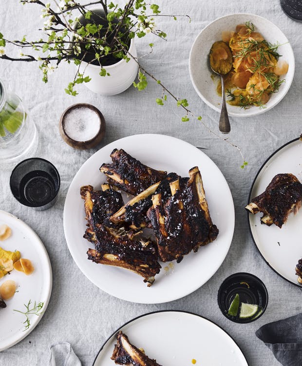 (OBS! Hvis du laver ribs, skal de først steges i ovnen ved 150° i ca. 1,5 time, hvile i 10 min., påføres marinaden og trække i minimum 2 timer, hvorefter de skal grilles ca. 5. min. på hver side).