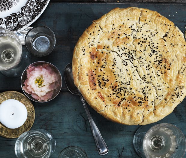 Kom yoghurt, smør, hvedemel og salt i en foodprocessor, og blend til en lind dej. Pak dejen ind i film, og læg den i køleskabet til den skal bruges, ca. 1 time.