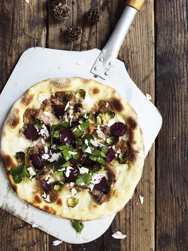Bag pizzaen på en opvarmet bagesten ved 300° (eller så varm ovnen nu kan blive) på indstillingen oven- og undervarme i fire minutter, til skorpen er gylden og bunden sprød. Har du ikke en bagesten, så forbag bundene uden fyld i 1-2 minutter, og læg så fyldet på. Imens pizzaen er i ovnen skærer eller skræller du ultratynde skiver af rødbeden, som du vender med lidt salt, peber, citronsaft og lidt olivenolie.