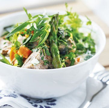 Skær gulerødderne i terninger og tilsæt dem i frikasseen. Skær aspargesene i stykker på tværs og kog dem i saucen med ærterne 4-6 min. før servering. Skær krydderurterne groft.