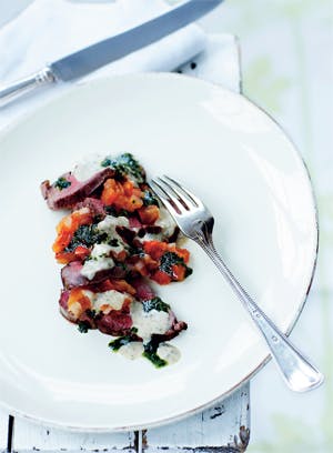 Blend basilikumbladene med hvidløg og tilsæt olien lidt efter lidt. Rør eventuelt mere olie i hvis konsistensen er for tør. Konsistensen skal være blød og moset. Anret et fad eller tallerkener med tynde skiver kalvemørbrad. Fordel tomatconcassé henover og bagefter tunsaucen. Dryp med basilikumolie. Server eventuelt med godt brød til.