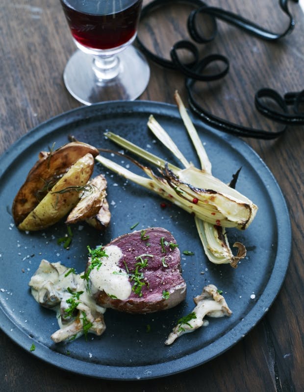 Hovedretten består af oksemørbrad med svampesauce, krydrede kartofler og fennikel. Et sikkert hit blandt gæsterne!