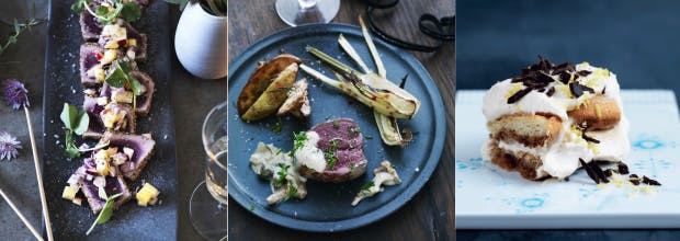 En klassisk treretters menu består typisk af en let forret, gerne fisk, en lidt tungere hovedret med et stykke kød og en sød dessert. Og det er netop den sammensætning, vi har fulgt her.