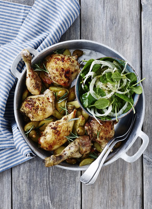 Her får du en dejligt nem aftensmad. Du skal blot lægge kylling og tilbehør i et fad, og så passer det sig selv i ovnen. I mellemtiden kan du lave salaten, og ellers hygge dig med familien. Hvis du har travlt, kan du bruge over- eller underlår i stedet for selv at partere en hel kylling.