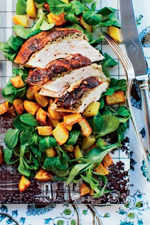 Tag kyllingen op og skær den for. Kog skyen ind i 8-10 min. Si den og server den til kyllingen.