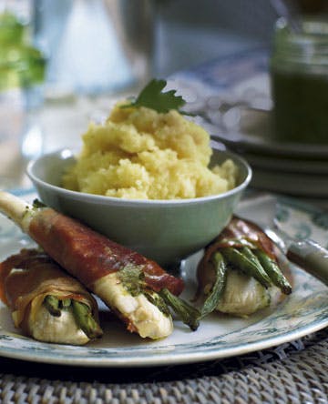 Tænd ovnen på 200°. Smør hver kyllingefilet med pesto. Læg 3-4 grønne bønner på en kyllingefilet, og drej ½ skive serranoskinke omkring. Læg kyllingefileterne i et ildfast fad. Dryp med olivenolie, og krydr med salt og peber. Steg kyllingefileterne i ovnen i 20 min.