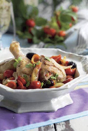 Del kyllingen i 8 dele. Brun kyllingestykkerne i olie i en stor gryde, og lad dem stege 10 minutter. Skær løg i både, hak hvidløg og chili fint, og kom det i gryden. Svits et par minutter, uden at det tager farve. Hæld hvidvin i retten, og lad den simre cirka 20 minutter med låg.