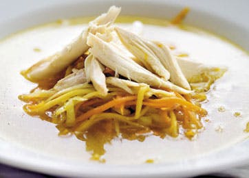 Fordel de sauterede grønsager i 4-5 dybe tallerkener, kom godt med den varme suppefond over, og top med kyllingestykkerne. Dryp med friskpresset lime- eller citronsaft til allersidst.