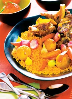 Couscous: Bring ca. 4 dl vand tilsat gurkemeje og salt i kog. Hæld couscousen i en skål og hæld det kogende vand over sammen med smørret skåret i terninger. Dæk med et klæde og lad det trække i 5 min. Rør i couscousen med en gaffel for at skille den. Server couscousen på et fad sammen med lam og grønsager. Hæld saucen over og server varm.