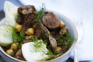 Knus de tørrede krydderier i en morter. Hak løg, hvidløg og ingefær. Bland kødet med de knuste krydderier, chili, hakkede løg og ingefær. Smelt smørret i en gryde, og brun det krydrede lammekød. Riv skallen af appelsinen. Tilsæt honning og revet appelsinskal. Hæld vand på til det dækker. Læg låg på gryden, og lad det simre i 30-40 min. til kødet er mørt. Kog de udblødte kikærter, til de er halvt møre,15-20 min., og hæld vandet fra. Hak fennikeltoppen og stilkene fint, og læg dem til side. Skær fenniklerne og savojkålen groft. Tilsæt fennikler, savojkål og kikærter i gryden. Kog i 8-10 min. Smag til med salt og peber og appelsinsaft. Pynt taginen med hakkede fennikelstilke og top.