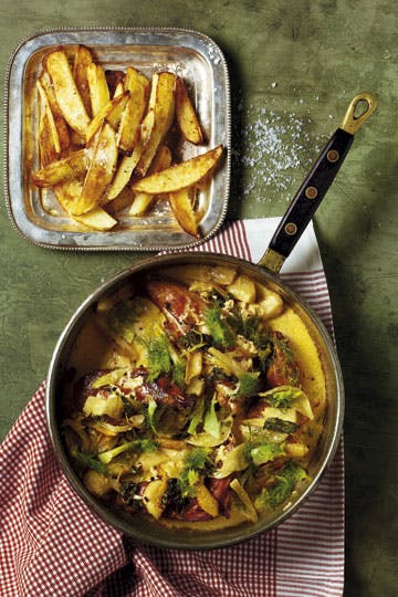 Hæld mælken over, og lad det hele simre i ca. 40 min. Mælken skal koge helt ind, til den har et grynet udseende. Vask kartoflerne godt, skær dem i tynde stænger, og vend dem med olivenolie, salt og peber. Bag kartoflerne midt i ovnen ved 210º i ca. 20 min, til de er gyldne og sprøde. Drys snittet fennikeltop over den braiserede fasan, og server med ovnstegte kartofler.