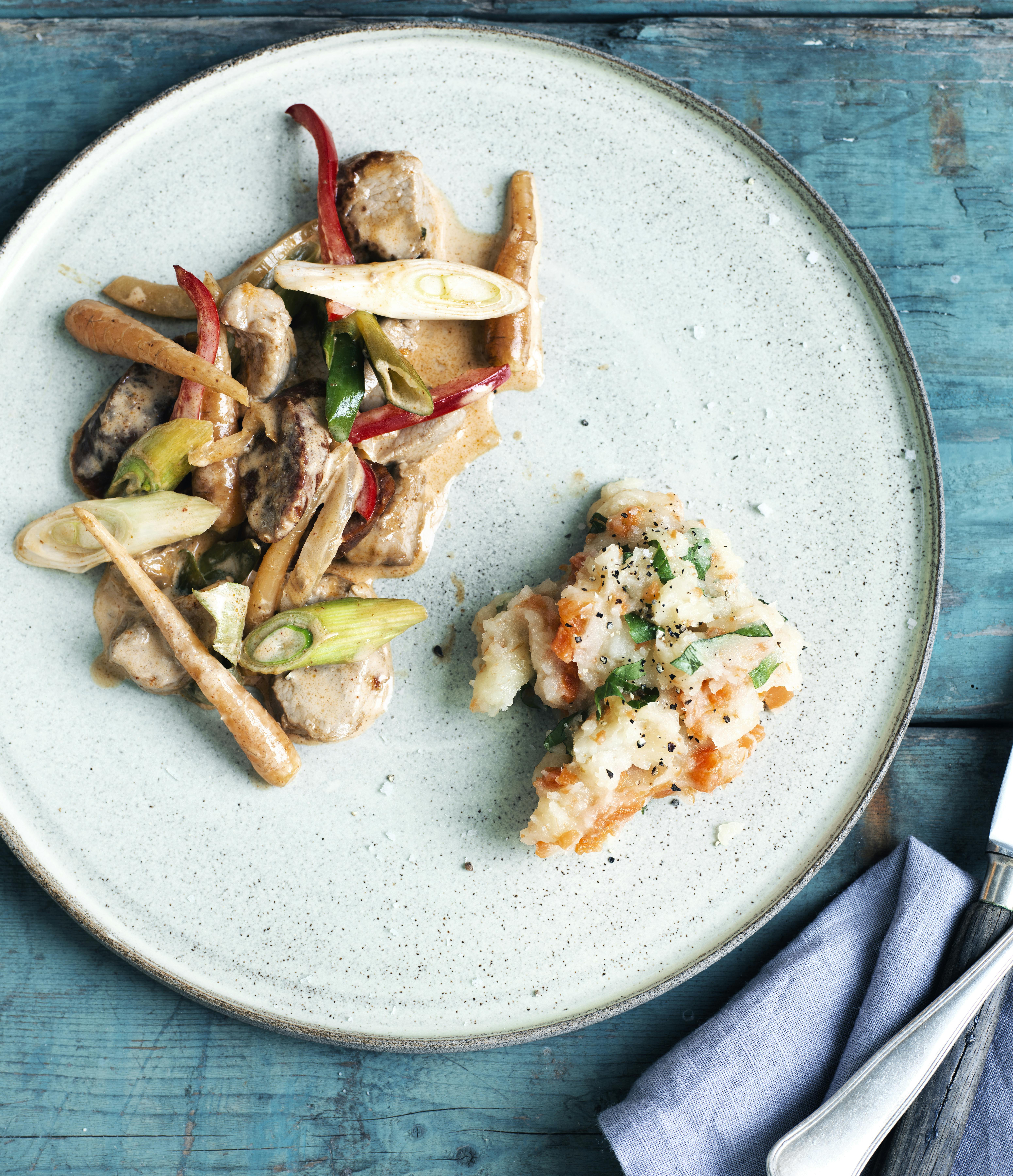 Mørbradgryde behøver ikke kun at være en simreret, man spiser om efteråret og vinteren. Ved at nyfortolke den klassiske ret kan den faktisk godt spises året rundt! Retten kan fx tilsættes nye, friske grøntsager, som giver masser af farver på tallerkenen. Prøv denne udgave af en mørbradgryde, som på smukkeste vis forener det thailandske køkken med dansk forårsgrønt.