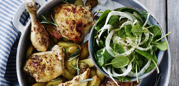 Opskrift på nem aftensmad med kylling i ovn, kartofler og fennikelsalat. Få den her