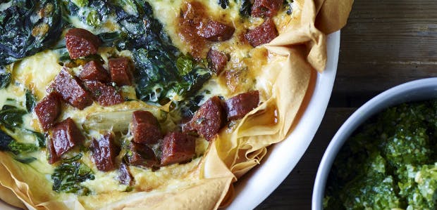 Opskrift på nem aftensmad med spinattærte og chorizo. Få den her