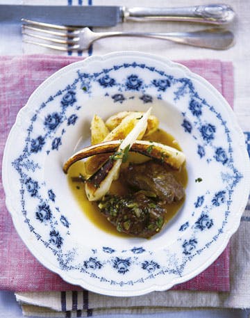 Tag kæberne op og sigt væden fra. Kom væden tilbage i gryden og smag den til med balsamicoeddike, salt, peber og appelsinsaft. Tilsæt eventuelt lidt vand, hvis skyen er blevet meget kraftig. Kom kæberne i saucen og varm retten igennem. Skræl kartoflerne og giv dem et opkog i letsaltet vand i cirka 5-8 minutter. Si vandet fra og tør dem godt. Krydr med salt og peber og steg dem gyldne i en blanding af olivenolie og smør.