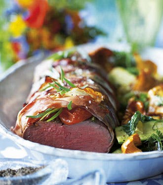 Tænd ovnen på 200°. Brun oksemørbraden på alle sider på en tør, hed pande. Krydr godt med friskkværnet peber. Fordel semidried tomater og estragonblade over mørbraden. Pak mørbraden ind i skinken. Læg mørbraden i en bradepande og steg den i 30 min. Tag stegen ud og lad den trække i 15 min. før den skæres i tynde skiver.