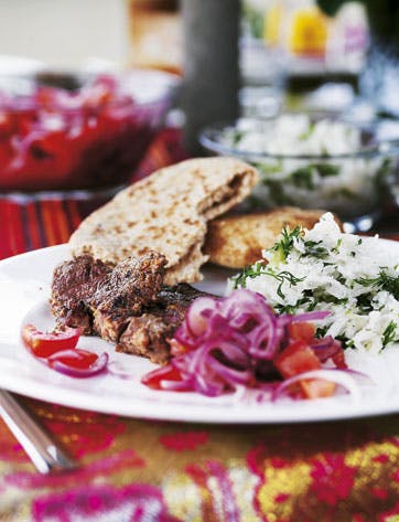 Knus kardemommefrøene i en morter og fjern skallerne. Blend papaja, yoghurt, lime, løg og krydderier til en marinade. Skær oksemørbraden i skiver på ca. 2 cm. Dæk kødet med marinaden og lad det trække i mindst 30 min. Grill bøfferne 3-4 min. på hver side.