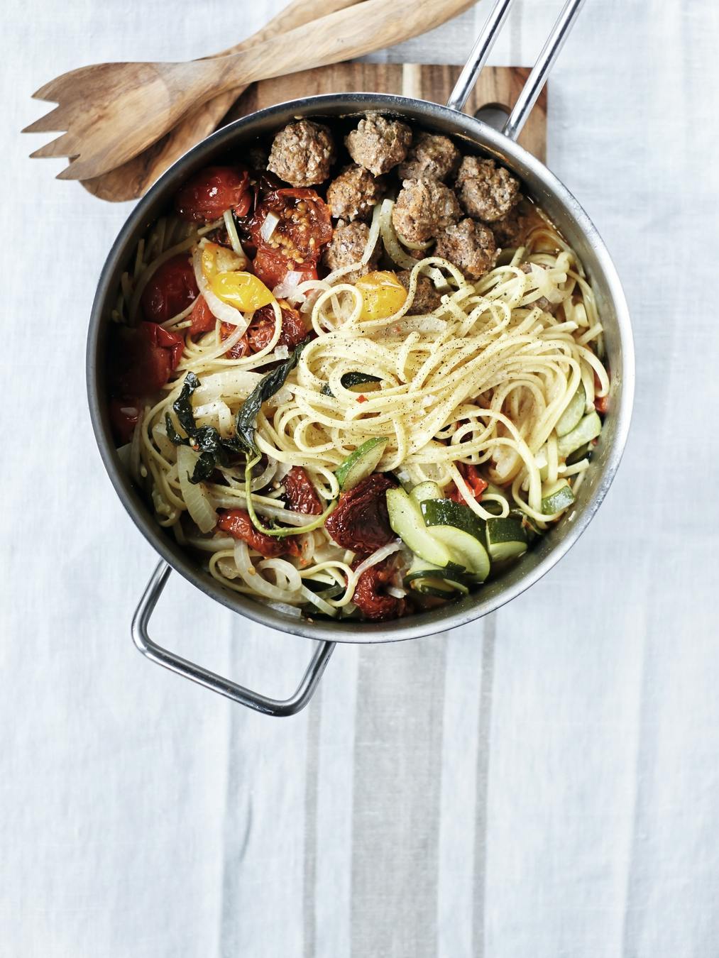 Det er næsten et helt lille mirakel, når der pludselig står et måltid klar efter nogle minutter i gryden. I one pot-retter samles al maden i en gryde, og her står det og passer sig selv helt indtil servering. Her får du opskriften på en lækker one pot-pasta med kødboller, tomater og squash. Mums!