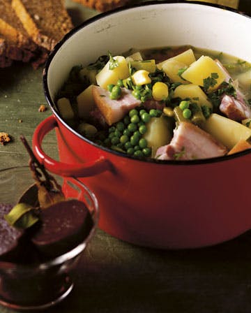 Skær baconen i tern på ca. 5 x 5 cm. Kom dem i en gryde med 1 l vand, og lad det simre i 20 min. Skræl kartoflerne, og skær dem i grove tern på ca. 3 x 3 cm. Skær porrerne i ringe. Kom kartofler og porrer i gryden med baconen, og lad det simre i ca. 20 min., til kartoflerne er møre. Kom ærterne i, og lad dem simre med de sidste 3 min.
