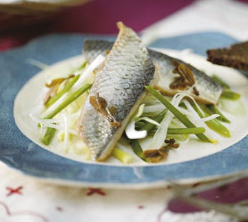Rens løgene og snit dem så fint som muligt langs årerne. Snit purløgene i tilsvarende lange strimler og vend dem i løgene. Smag til med lage fra sildene, salt og peber. Anret sildene på løgsalaten og server pumpernikkel til.