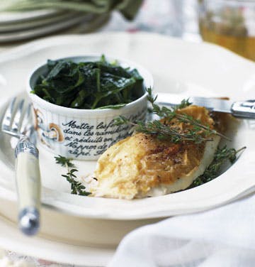 Skær kyllingen ud, og server med den lune spinat og naturligvis sprød baguette