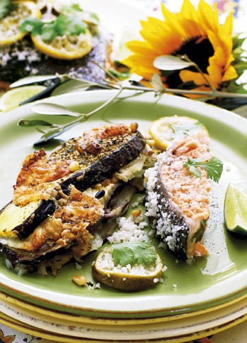 Fjern alt saltet, og skær fisken i tykke skiver. Anret med citron- og limeskiver, og server auberginegratinen til.
