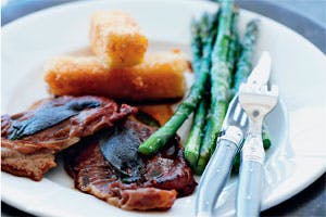 Hæld Marsala på panden og lad det koge ind 3-4 minutter. Hæld den indkogte Marsala over kødet og server. Pynt med friske salvieblade.