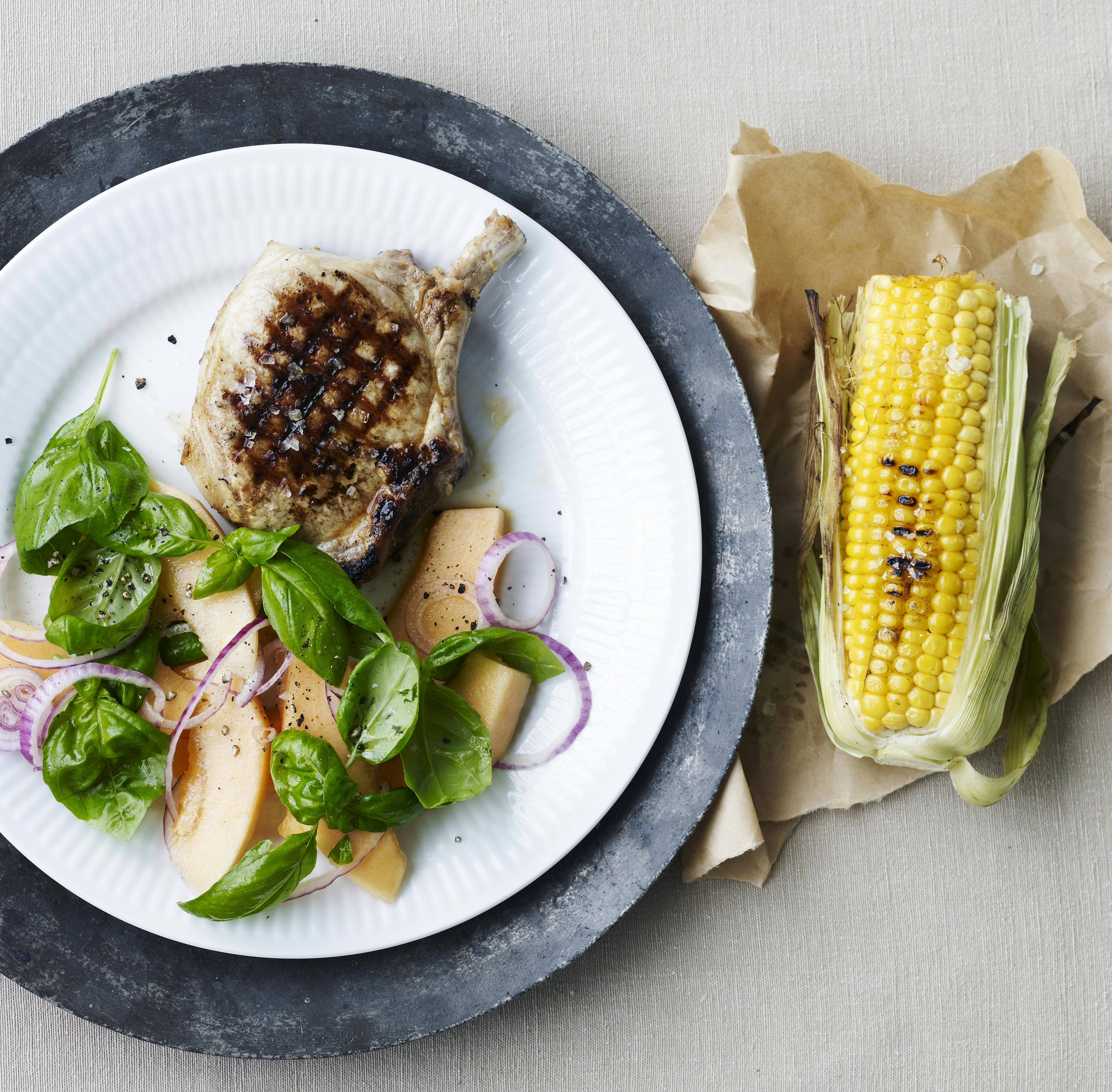 Krydr med salt og peber. Vend imens løg, melon, basilikum, olie og citronsaft sammen. Smag salaten til med salt og peber. Servér majskolberne med smør og salt, grillede koteletter, melonsalat og nye kartofler.