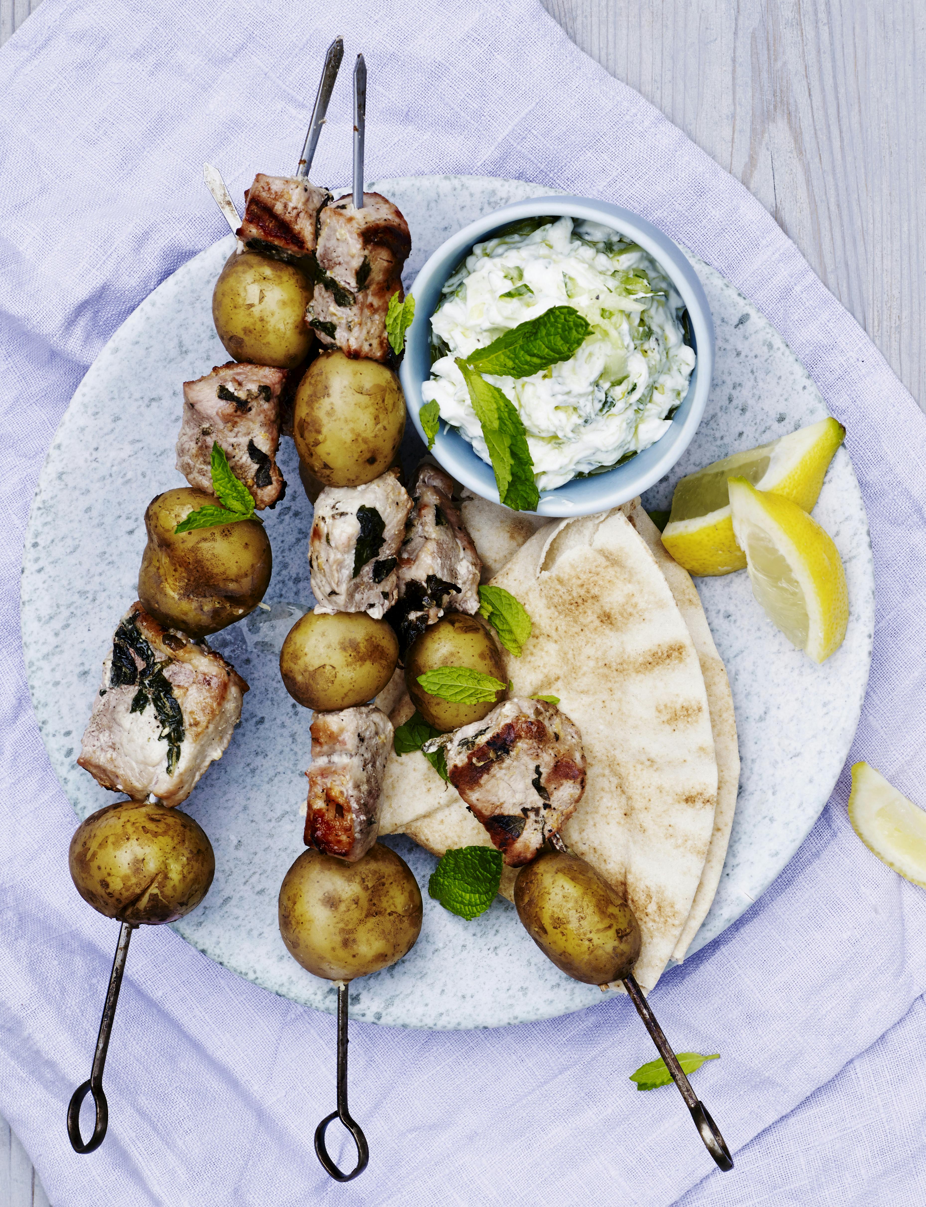 Spyd med hvidløgsmarineret svinekød og myntetzatziki