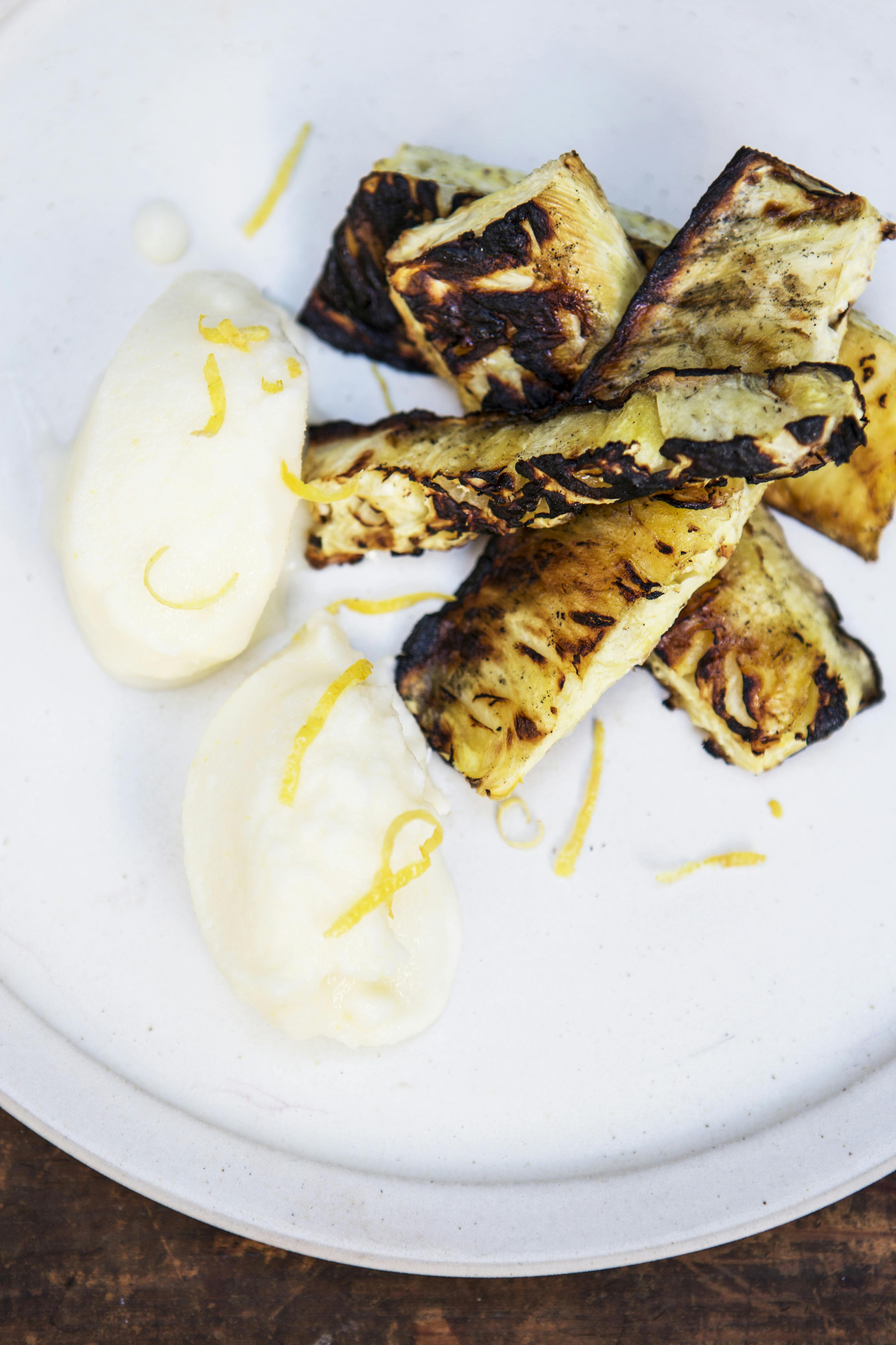 Skær auberginerne i tynde skiver, ca. ½ cm på den lange led. Vend skiverne med lidt olivenolie (3-4 spsk.), salt og friskkværnet peber. Grill skiverne ca. 1-2 minutter på hver side, så de får flotte mørke grillstriber.