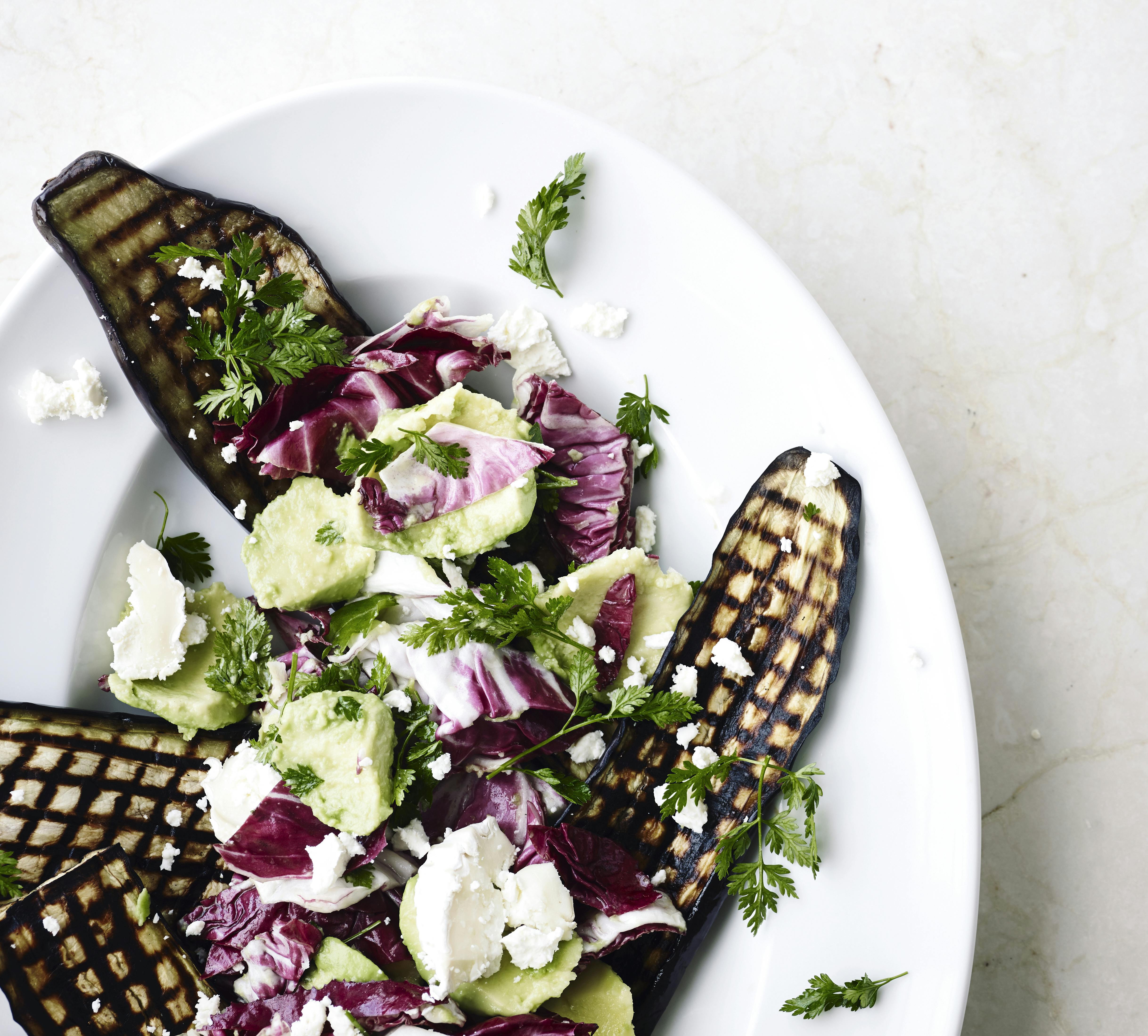 Tag auberginerne af grillen, og læg dem på et fad. Del radicchioen ud i mindre stykker, skyl dem i koldt vand, og afdryp grundigt. Flæk avokadoerne, fjern stenene, og skær avokadoerne ud i mindre stykker. Fordel avokado, radicchio og gedeost ud over de grillede auberginer.