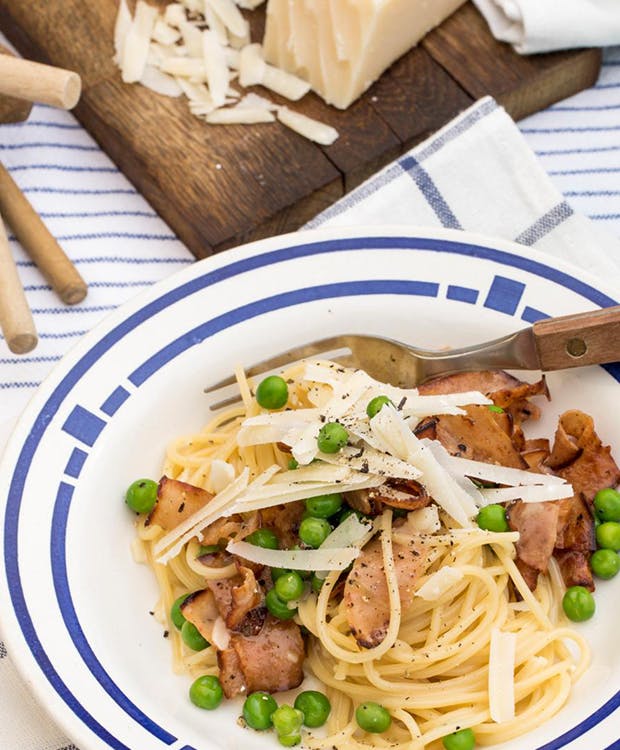 TIP: Gør den lækre spaghetti carbonara endnu mere cremet med rigeligt med parmesan på toppen!