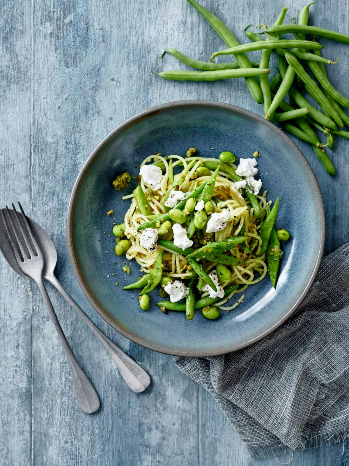 Den her lækre og nemme opskrift på spaghetti med bønner og ricotta er ikke bare hurtig og nem mad, men den pynter tilmed på middagsbordet — den er jo smuk og frisk at se på med gul, grøn og hvid, og så som her på en blå tallerken — det er lige så tænderne løber i vand.