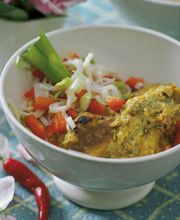 Skyl citrongræs og limeblade, og hak citrongræsset. Tilsæt koriander, spidskommen, citrongræs, limeblade og kokosmælk. Læg kyllingestykkerne i gryden, og lad det hele simre under låg i cirka 40 minutter. Kog nudlerne (se opskrift på pakken). Rens forårsløg og peberfrugt, snit dem fint, og vend dem i nudlerne. Smag til med salt og peber. Server straks med kyllingen.