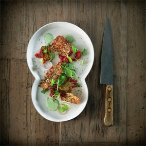 Anret tatar med brøndkarse creme, tang, skalotteløgs ringe og frisk brøndkarse og det sprøde rugbrød, krydre til sidst med havsalt og friskkværnet peber.