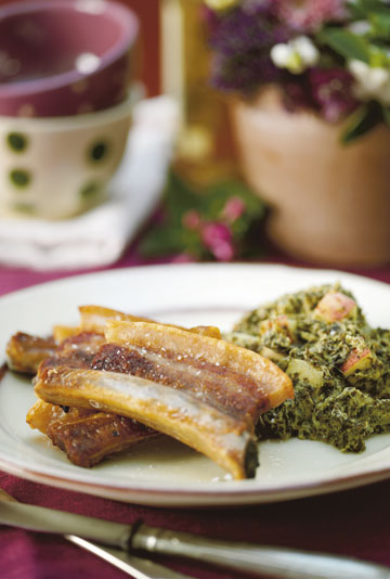 Læg flæsket på en rist og drys med salt. Steg flæsket i ovnen cirka 25 min ved 200 grader med en bradepande under risten. Hak løgene og sauter dem i lidt olie. Tilsæt grønkål. Riv appelsinskallen. Halver appelsinen og pres saften. Vend saft og skal i grønkålen.