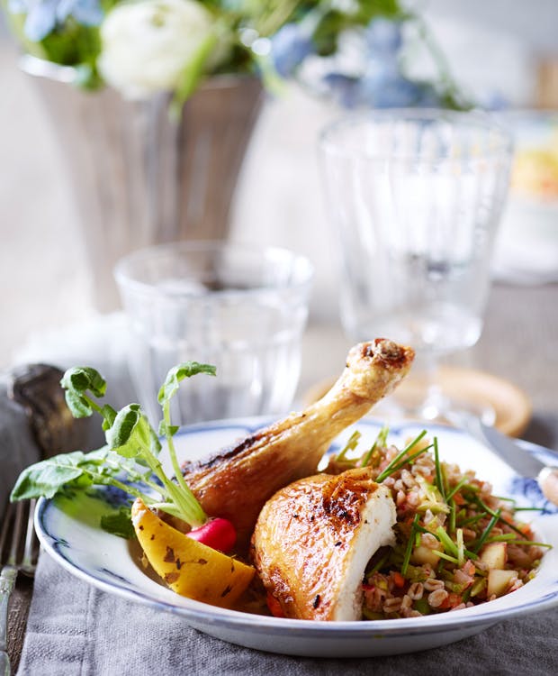Det skal du bruge til stegt kylling med røget paprika og grøn speltsalat: