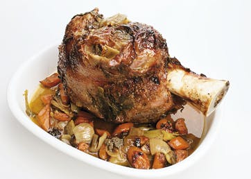 Lad skanken hvile i ca. 15 minutter, inden den skæres ud i tynde skiver. Hæld urtesaucen fra fadet over og server f.eks. med ovnstegte kartofler.