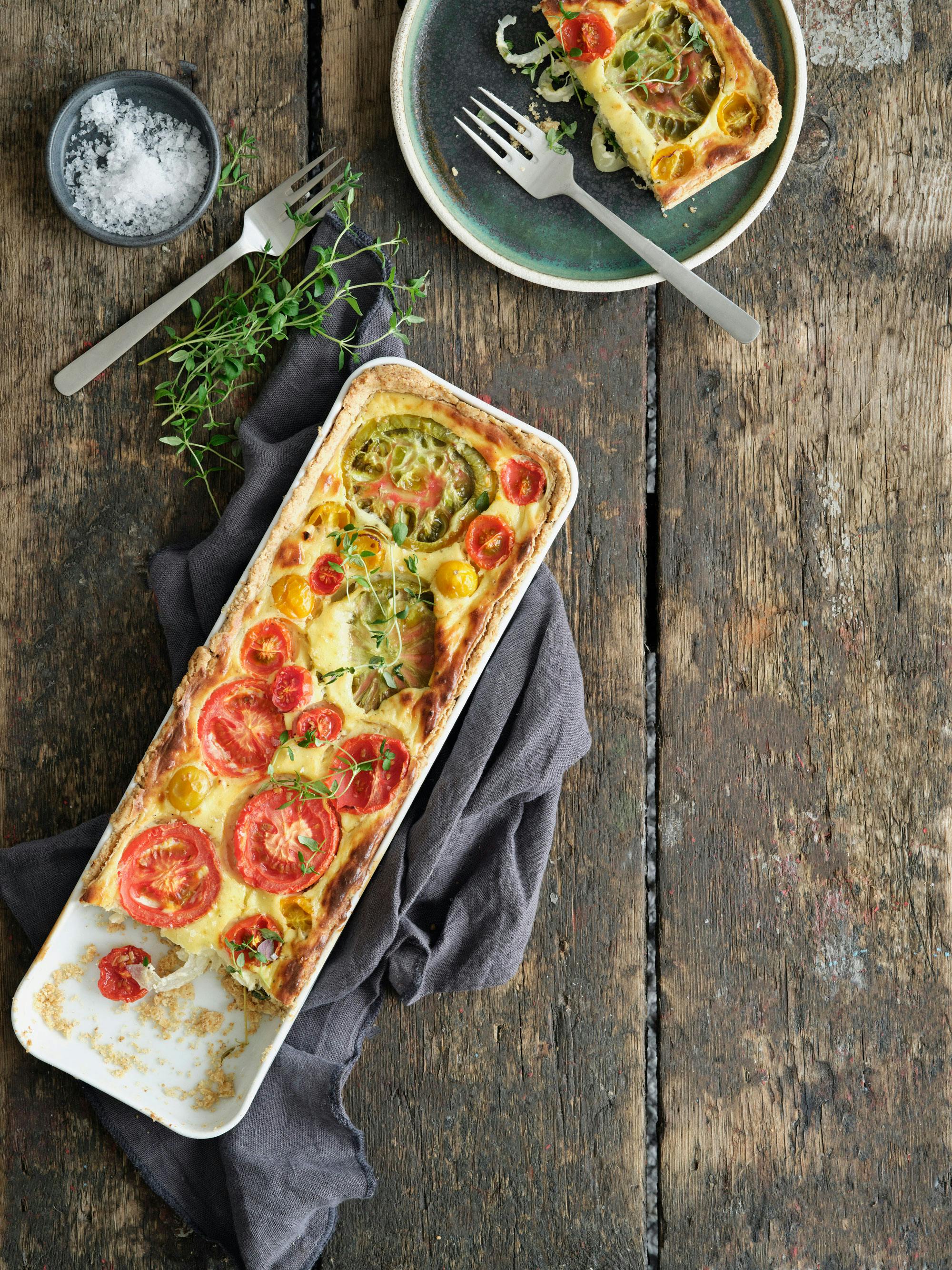 Skyl tomater, og skær dem i tykke skiver. Fordel dem oven på bunden, og hæld æggemassen over. Bag tærten i ovnen i 20-25 minutter, til den er gylden. Lad tærten afkøle let, og servér.