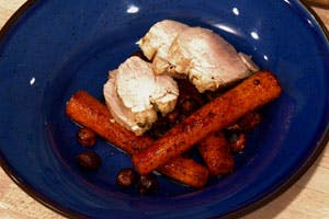 Prøv timian-saltet, pocheret svinemørbrad af Dansk Frilandsgris med stegte gulerødder og brombær.