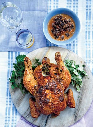 Tænd ovnen på 200°. Hak det ene fed hvidløg fi nt sammen med 4 kviste persille. Riv skallen fi nt af citronen. Ælt citronskal, smør, hakket hvidløg og persille sammen til en pasta. Løft skindet på unghanen ved åbningen til dens indre og list fyldet forsigtigt ind uden at ødelægge skindet. Gnid med fl ad hånd oven på brystet, så fyldet fordeler sig. Gnid herefter unghanen i havsalt indvendig og udvendigt. Skær citronen i grove terninger og fyld dem i kyllingen sammen med resten af persillen. Dryp unghanen med olivenolie og krydr med peber. Steg hanen i 1 time og 15-20 minutter. Tjek at kødsaften er klar og gennemsigtig, når man hiver fuglen i låret. Er kødsaften blodig, skal unghanen have lidt længere.
