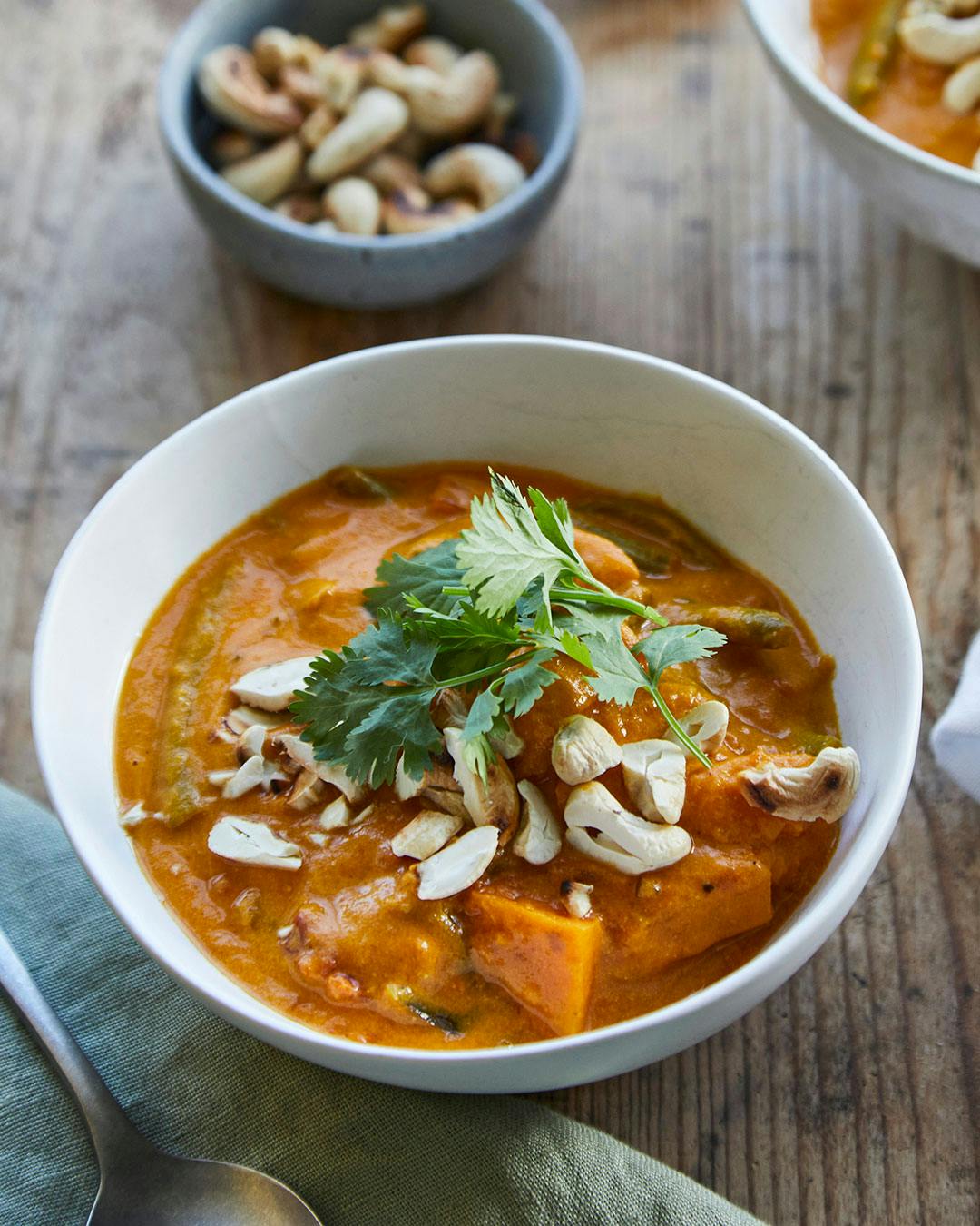 Top retten med cashewnødder og koriander, og servér den evt. med kogte ris.