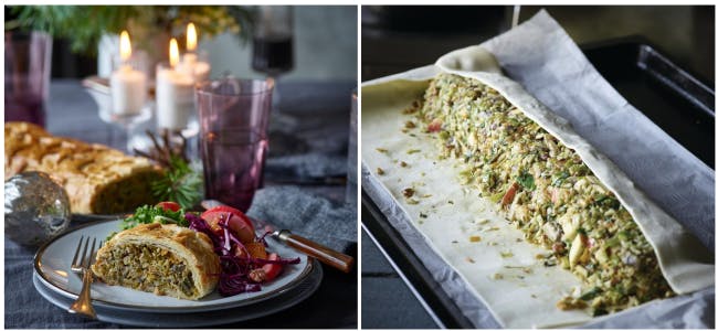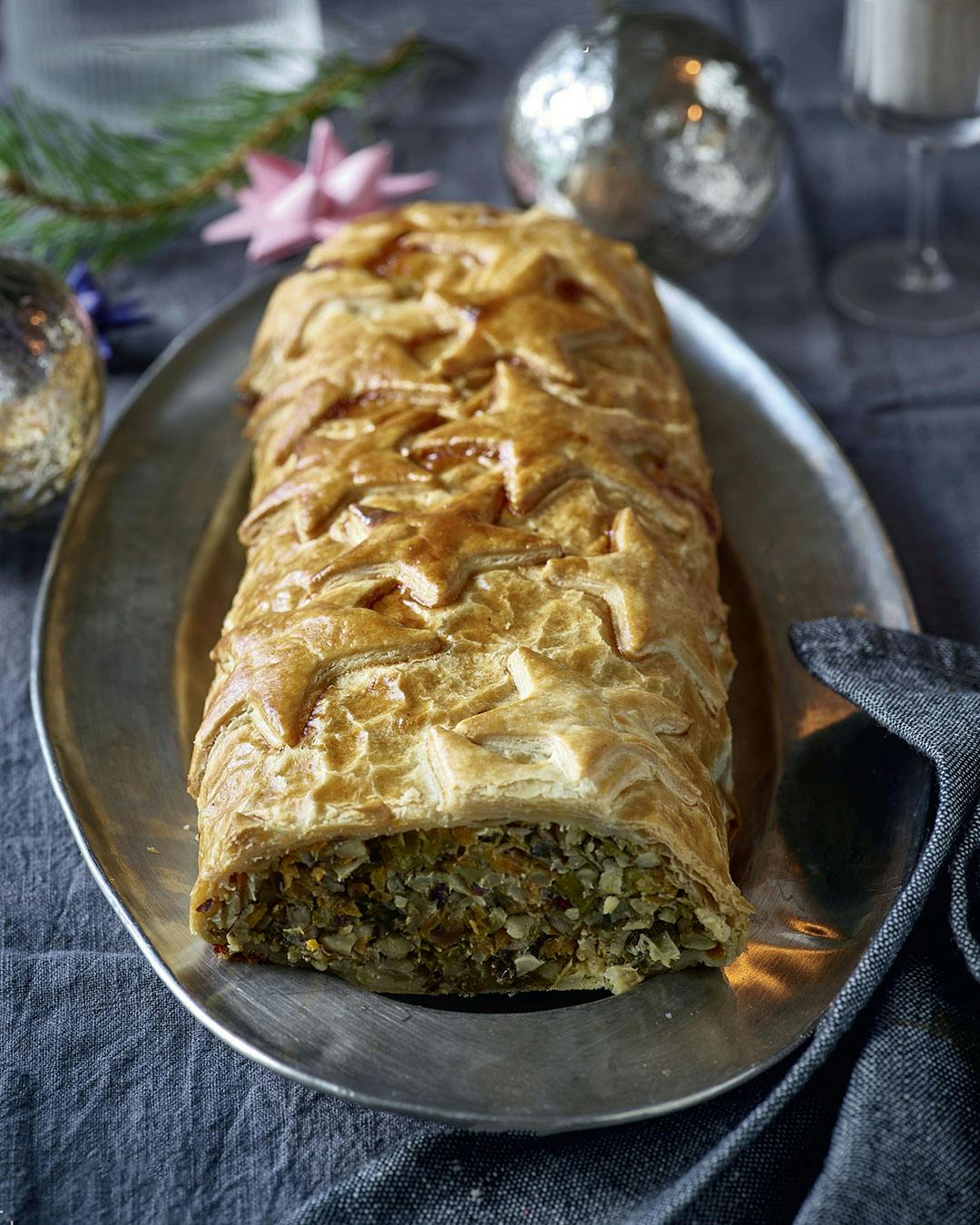 Grøntsager, nødder, ris og sprøde æbler udgør det lækre fyld i denne vegatariske nøddepostej, som vi har pakket velsmagende ind i butterdej. Den er både nem at lave og smager virkelig skønt. Den spiselige stjernepynt kan du naturligvis blot udelade, hvis den skal på bordet en hverdagsaften.