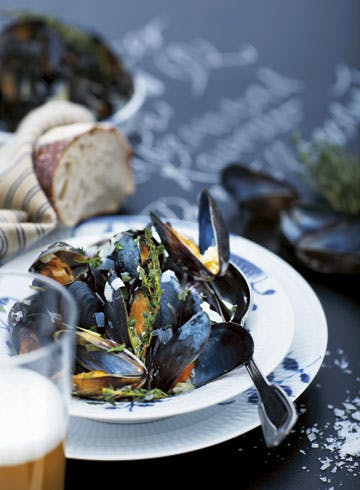 Anret muslinger og suppe sammen og server med øl og groft brød.