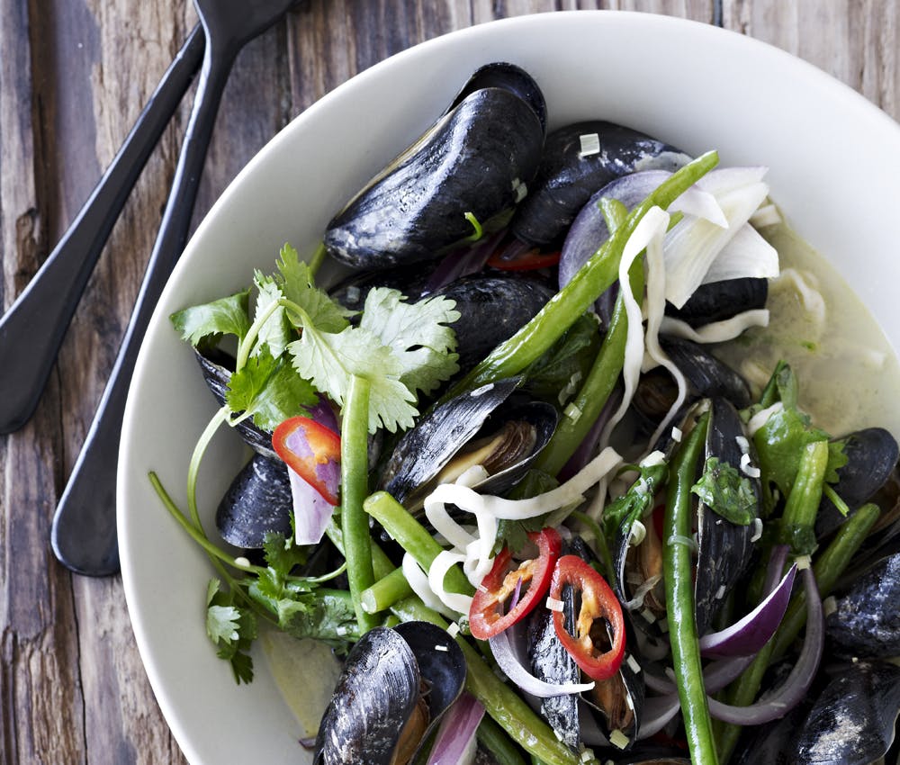 Du kan sagtens droppe kødet flere dage i løbet af ugen og spise masser af grønt til hverdag i stedet. Prøv fx denne ret med blåmuslinger, nudler og mættende bønner med et lækkert strejf af Asien.