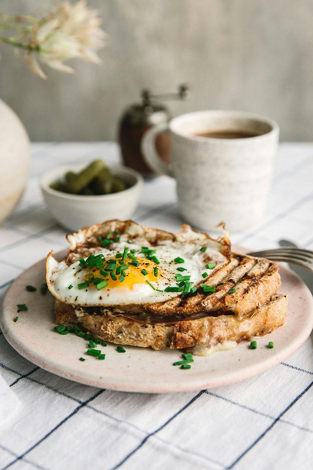 Anret de varme, grillede sandwich med æg på toppen og evt. lidt ekstra purløg.