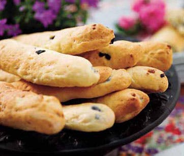 Rør gæren ud i vandet, tilsæt salt. Rør durummel i og derefter hvedemel, til dejen slipper skålen. Hak olivenerne groft, og smuldr osten. Ælt begge dele ind i dejen. Stil dejen til hævning ca. 30 minutter ved stuetemperatur. Slå dejen ned, og del den i 20 lige store stykker. Ælt hvert stykke, og form det til flute. Lad dem hæve 30 minutter. Bag dem ved 200º i ca. 30 minutter. Lad dem køle af på en rist.