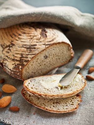 Dag 1: Opløs gæren i vandet. Tilsæt de øvrige ingredienser, og ælt dejen i mindst 20 min. i hånden eller i køkkenmaskine til den er elastisk. Arbejd mandlerne godt ind i dejen. Lad dejen hæve natten over i en skål med husholdningsfilm over.
