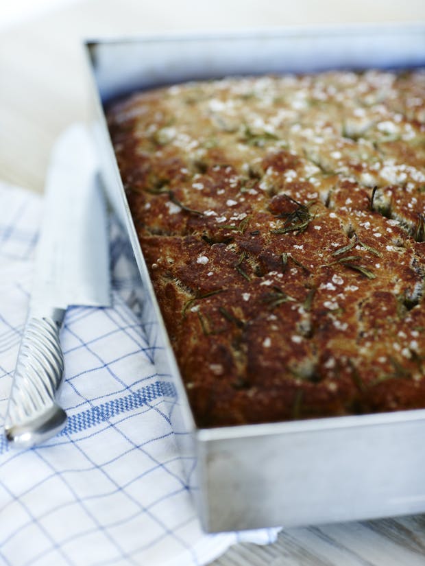 Mette Blomsterberg er kendt for sine smagslækre og smukke kager, men derfor kan Danmarks kagedronningen sagtens trylle et helt fænomenalt brød frem. Det her saftige focacciabrød er toppet med aromatisk rosmarin, og prikken over det berømte i er det knasende og simple flagsalt.